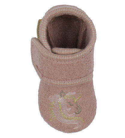 Süße En Fant Hausschuhe aus rosa Wolle, und am Fuß befindet sich ein gestricktem Einhorn in hellem Hellrosa und Gold.