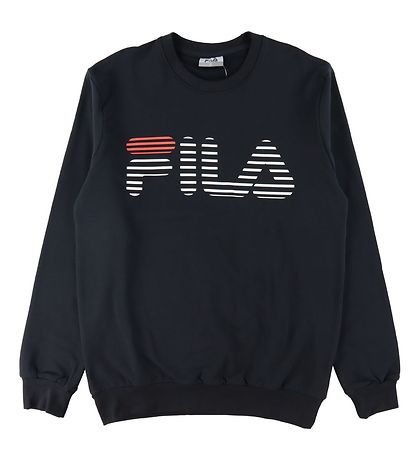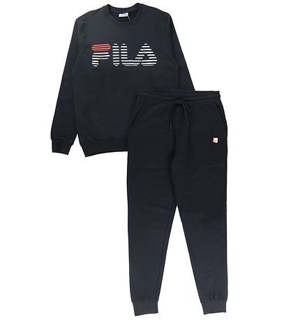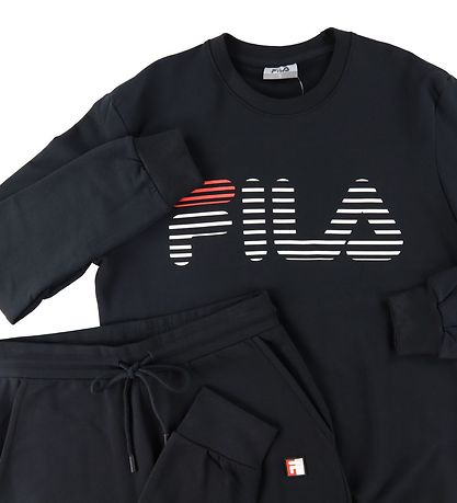 Coole Fila Schlafanzug bestehend aus einem Sweatshirt und einer Jogginghosen in Schwarz. Das Sweatshirt hat auf der Brust ein Fila Logo in Weiß und rot. Die Jogginghose hat ein kleineres Fila Logo auf dem linken Oberschenkel.