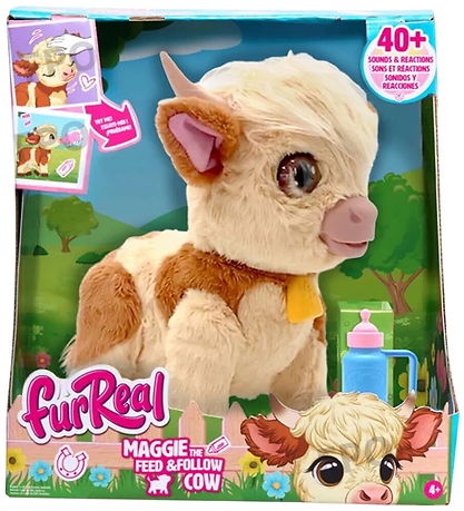 Der FurReal Kuscheltier ist interaktiv mit über 50 Geräuschen und Reaktionen, die Kinder auf spielerische Weise unterhalten. Perfekt für Spiel und Spaß. Wenn man der Kuh zum Beispiel eine Flasche gibt, macht sie Geräusche und rülpst. Die Kuh kann auch auf die Flasche zugehen und mit dem Schwanz wedeln.