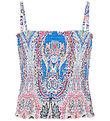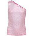 Das Grunt Top ist auf der rechten Seite schulterfrei und hat auf der rechten Seite Puffärmel. An den Hals- und Ärmelöffnungen befindet sich eine schmale Gummirand und unten eine breite Gummirand.
