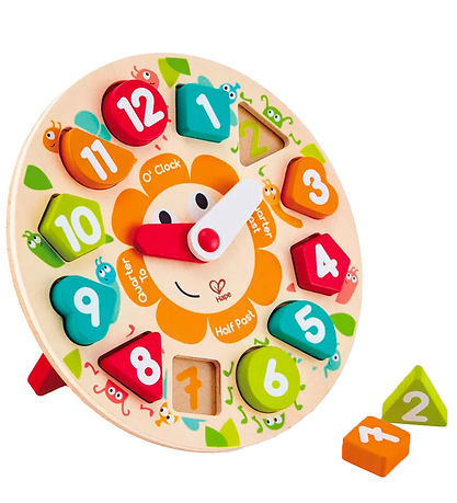 Buntes Hape Motorikspielzeug in Form einer Holzuhr mit niedlichem Print einer Blume und verschiedener Insekten.