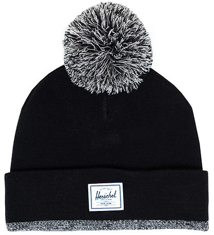 Wunderschöne Herschel Mütze aus schwarzem Strick mit grau in meliertem Basis und Quaste sowie einem weißen Logo-Patch auf der Vorderseite.