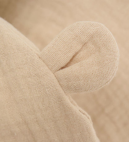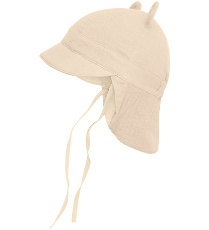 Niedliche Huttelihut Schirmmütze in Beige mit Musselinstruktur und zwei süße Bärenohren Top drauf.