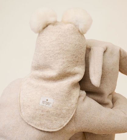 Wunderschöne Huttelihut Schlupfmütze in meliert beiger, gefilzter Wollqualität mit süßen Pelz-Quasten Top in Weiß.