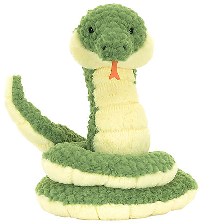 Schöne Jellycat Kuscheltier in Schlangenform in Grün mit hellgelben Details.