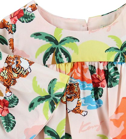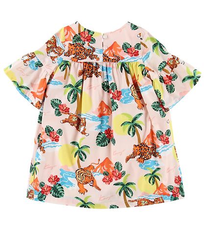 Entzückendes Kenzo Kleid in Puder mit einem bunten Muster aus Katzen, Palmen, Palmblättern und Blumen, Bergen und feinen Sonnenuntergängen.
