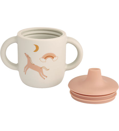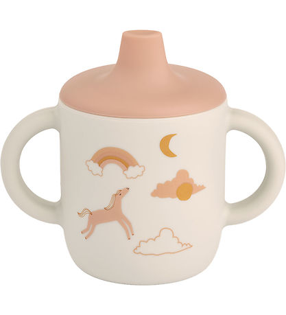 Coole Liewood Becher in Cremeweiß mit Print von Pferd, Regenbogen, Wolken und Monden in Rosa- und Nuancen. Der Deckel des Bechers mit Trinkschnabel ist rosa.