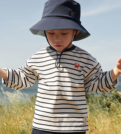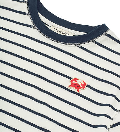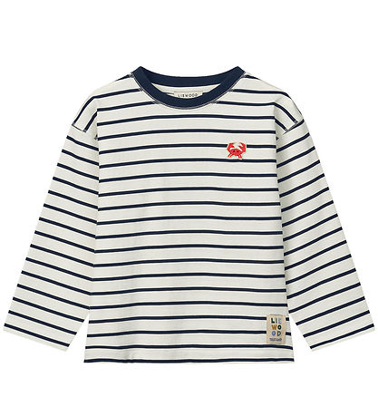 Schön Liewood -Bluse mit langen Ärmeln in klassischem Weiß mit Marineblau Streifen. Auf der Vorderseite ist die Liewood Bluse mit einem klein, roten Krabbenaufdruck verziert, der für eine nette Note sorgt.