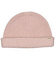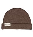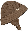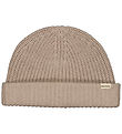 Schöne MarMar Babymütze in einfarbigen Beige in gestrickter mit Rippstruktur. Die Mütze hat eine Rund Kopfform und eine hat eine breiten Rand mit Umschlag.