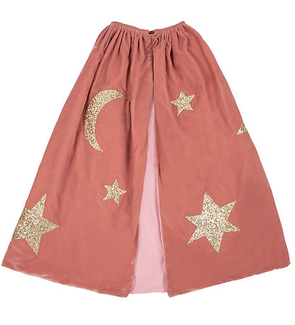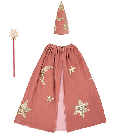 Schön Meri Meri Kostüm aus rosa Velours mit goldfarbenen Sternen und Monden. Das Set besteht aus einem Spitz Hut, einem Umhang und einem Zauberstab, sodass Sie wie ein schön Zauberer aussehen können.