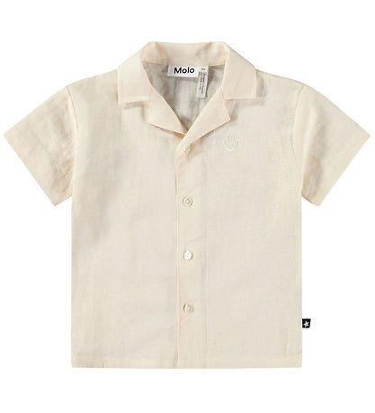 Schönes Molo Hemd mit kurzen Ärmeln in einem hellen Beigeton und mit einem dezenten, gestricktem smiley auf der linken Brust.