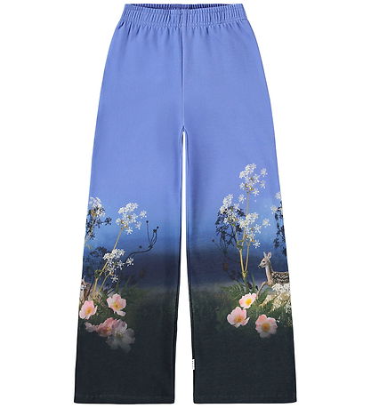 Schöne Molo Jogginghosen in Blau, die allmählich dunkler wird. Unten befindet sich ein schön Naturdruck. Die Jogginghose hat eine entspannte Passform mit weiten Beinen und einem elastischen an der taille, der für einen guten Sitz sorgt. Innen befindet sich weiche, gebürstete Baumwolle.