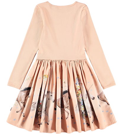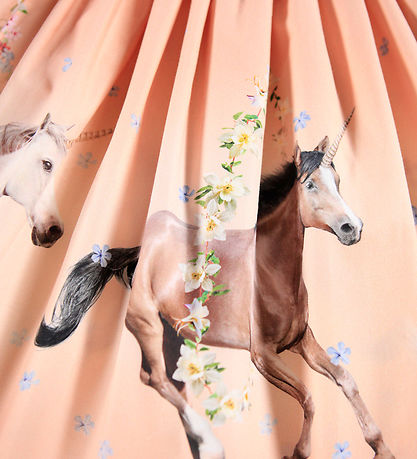 Bezauberndes Molo Kleid in Blass Rosa mit geripptem Oberteil und einem schlichten, dicht gewebten Rock aus Baumwollflanell, verziert mit Einhörnern und bunten Blumen. Der Rock ist innen aus gebürsteter Baumwolle, was ihm einen weichen und warmen Effekt verleiht.