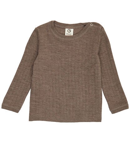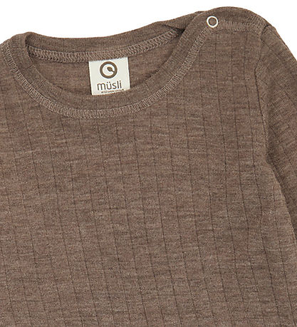 Ansprechender Müsli Bluse in einfarbigen Braun mit Rippstruktur. Die Müsli Bluse hat lange Ärmel und schmale Kanten und wird an der linken Schulter mit Druckknöpfe geschlossen. Die Bluse ist aus weicher Bio-Merinowolle in leichter Qualität gefertigt.