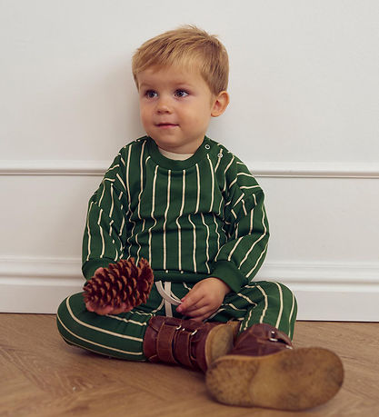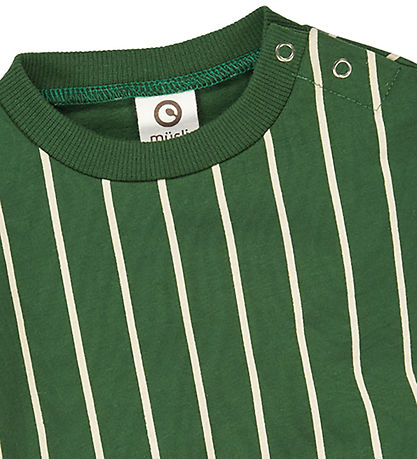 Elegantes Müsli Sweatshirt in tiefgrüner Farbe mit vertikalen, weißen Streifen. Das Sweatshirt von Müsli hat lange Ärmel und Gerippte Kanten und wird an der linken Schulter mit Druckknöpfe geöffnet. Auf der Innenseite besteht das Sweatshirt aus weicher, gebürsteter Baumwolle.