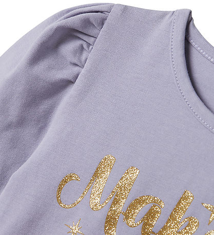 Wunderschöne Name It -Bluse in Helles Lila Farbton, verziert mit einem"Make a Wish" Print in Gold und der Hauptfigur Asha aus"The Wish", die dem Design einen verspielten Ausdruck verleiht.