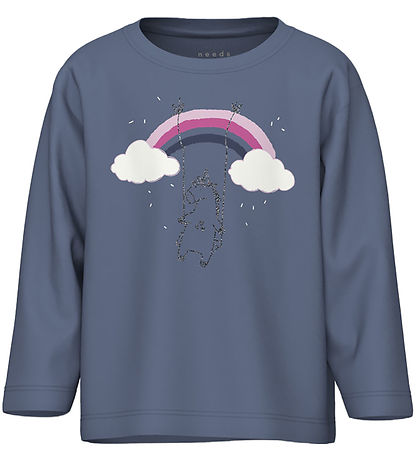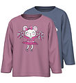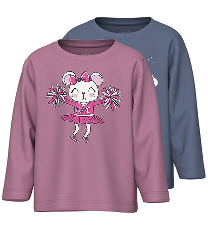 Schöne Name It Bluse. Die Bluse in sanftem mauve mit einem süßen Print einer fröhlichen Maus, die mit Pompons tanzt, und einem wunderschönen pink Kleid. Die andere Bluse ist in einem gedämpften lila gehalten und zeigt ein Einhorn auf einer Schaukel unter einem Regenbogen. Die Blusen haben lange Ärmel.