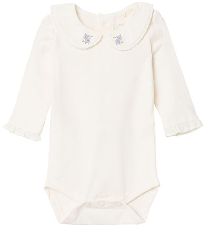 Entzückender Name It Body in Weiß mit dekorativem Spitzenkragen im Halsausschnitt mit feinen, gestickten Blumen in in Lila und Nuancen.
