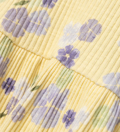 Wunderschönes Name It Kleid in weicher und leichter Rippqualität mit einem Allover -Blumenmuster in lila und Nuancen auf gelbem Grund. Das Kleid hat kurze Ärmel mit Rüschen und einen Rock mit guter Weite.