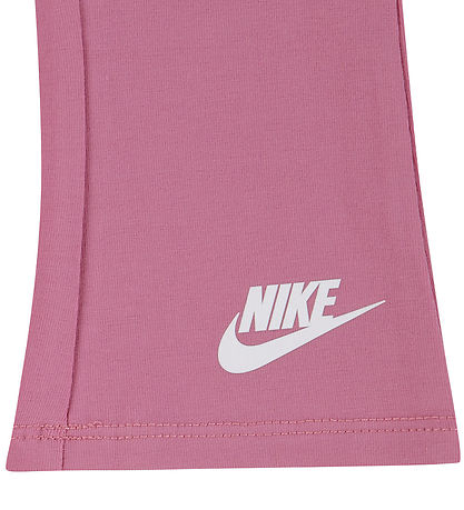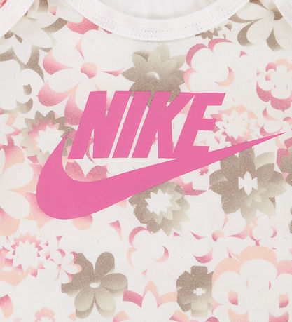 Bezaubernder Nike Body in Weiß mit blumig und pink Logo auf der Brust und ein Paar rosa Leggings mit Weiß Logo unten am rechten Bein.