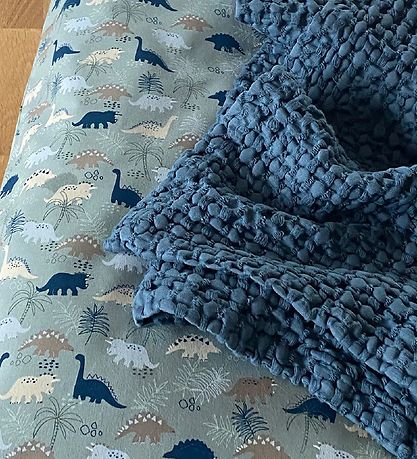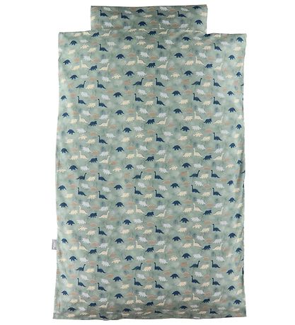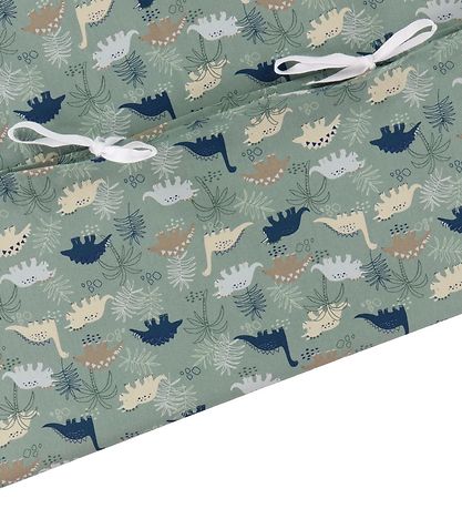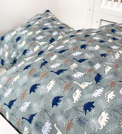 Feine Bettwäsche von Nørgaard Madsens in Mattgrün mit einem Allover-Print von Dinosauriern, die vor Feuer fliegen und sich übergeben.