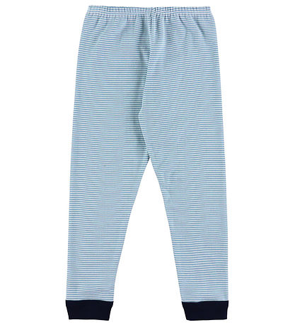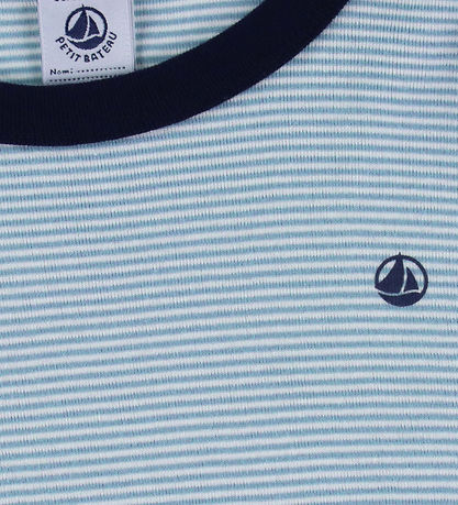 Bequeme Petit Bateau Schlafanzug bestehend aus Bluse und Hosen im feinen Streifendesign in Hellblau und Weiß, das ein schlichtes Design ergibt. Das Petit Bateau Logo ziert die Vorderseite.