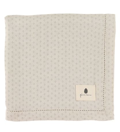 Schönes Pine Cone Wickeltuch in Cremeweiß mit einem Allover in Grau. Im Rand befindet sich ein feines Lochmuster.