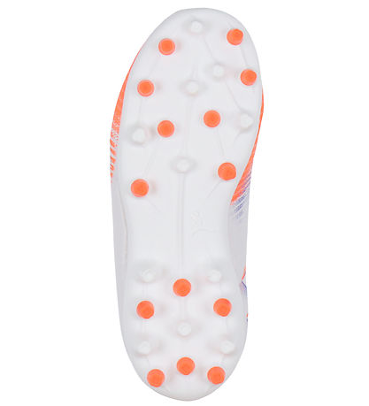 Schicke Puma Fußballschuhe in Weiß mit dynamischem orange-blauem Muster und dem bekannten Logo-Print an der Seite.