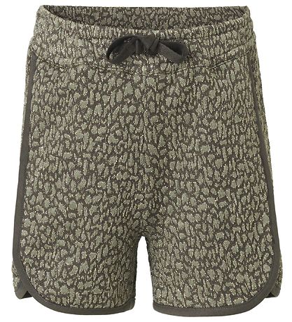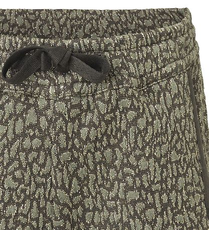 Schöne Rosemunde Shorts in Olivgrün. Die Shorts haben einen Allover - Leopardprint, bei dem die Ränder der Leopardenpunkte in Glitzer sind.