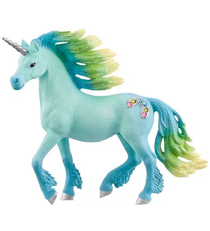 Schön Schleich Bayala Einhornhengst "Candyfloss" in Türkis, mit Details in Mähne und Schweif in Grün- und Nuancen, mit schön glitzer. Auf der einen Seite gibt es das schöne Strassstein in Form eines Herzens.