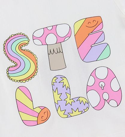 Schön Stella McCartney Kids T-Shirt in Weiß, auf der Vorderseite steht"Stella" in bunten, gemusterten Buchstaben aufgedruckt.