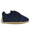 Süße Wheat Hausschuhe aus marineblauem Wollfilz mit dezentem Logo auf dem Klettverschluss.