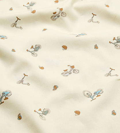 Fine Cam Cam Copenhagen bedding in beige with an allover print of fine, small bicycles in shades of blue, green and brown.