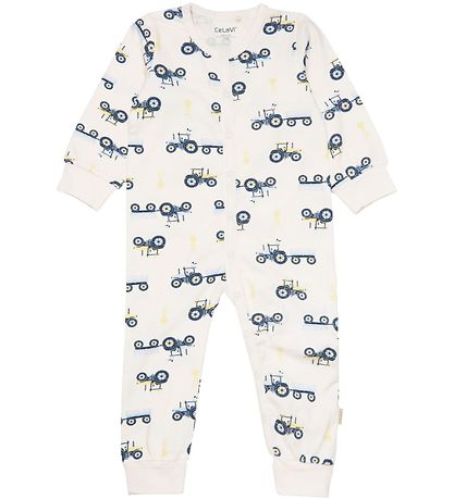 Beautiful CeLaVi nightsuit in creamy white with an all-over-print of yellow and light blue tractors.