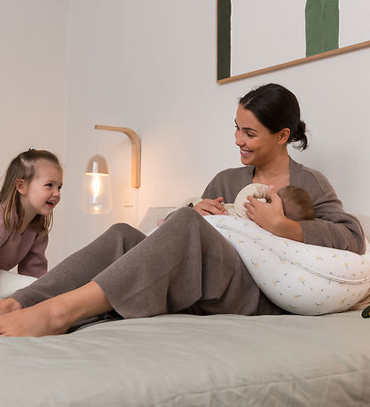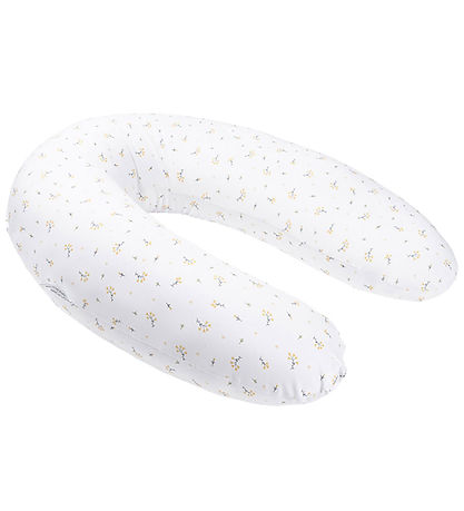 Beautiful Doomoo pregnancy and nursing pillow in white cotton jersey with an allover flower print in yellow and green colours.