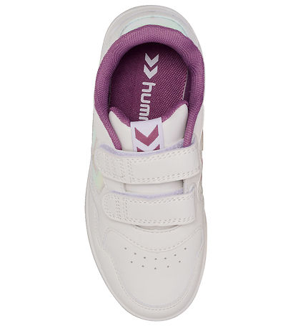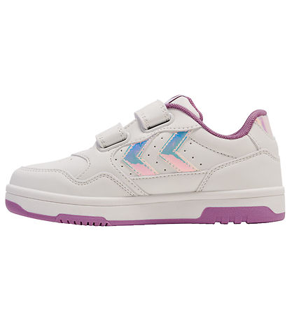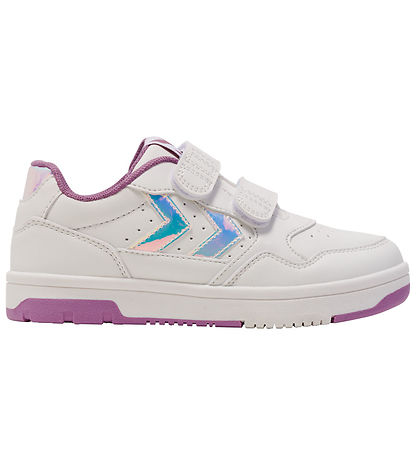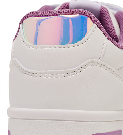 Cool Hummel shoe in white, imitation leather with purple details and Hummel shevrons in a shiny, holographic material.
