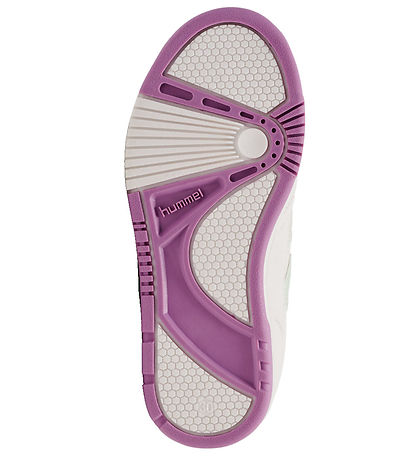 The shoes have a purple and white outer sole and under the bottom there is a Hummel pattern, which ensures a good foothold.