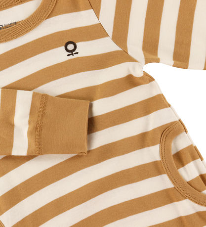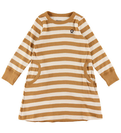Delicious Katvig dress with horizontal stripes in caramel brown and white. The Dress has caramel brown edges.
