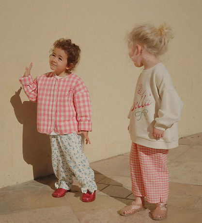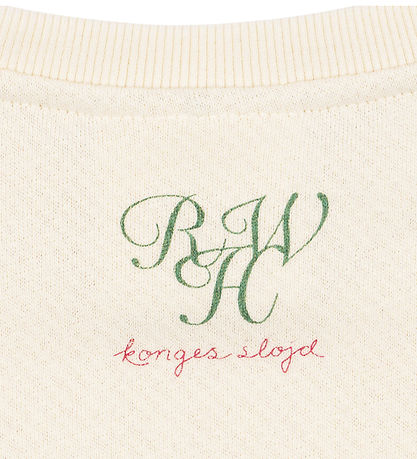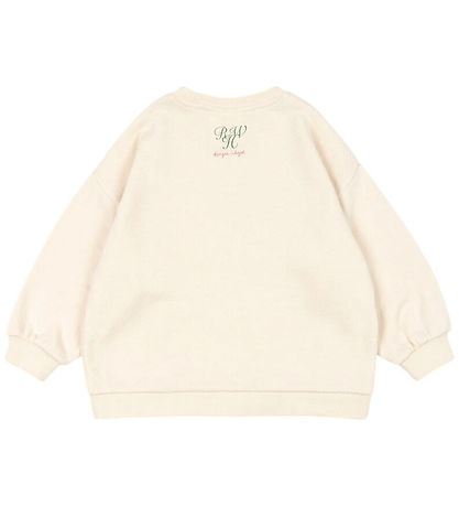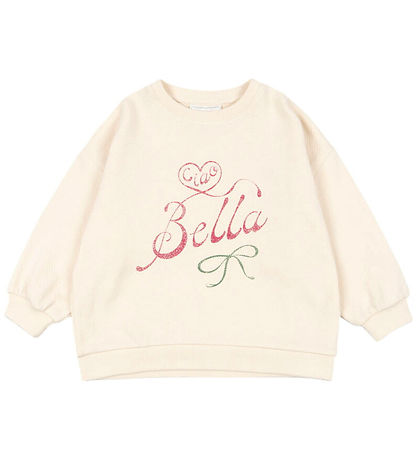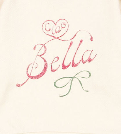 Cool Konges Sløjd sweatshirt in light cream with the text "Ciao Bella" and a bow printed in pink and green on the front. The Sweatshirt has a round neckline and long sleeves with ribbed edges at all openings.