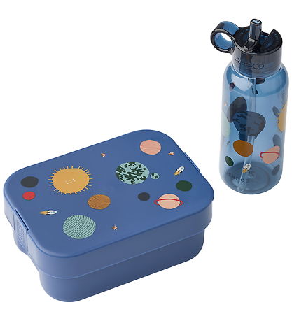 Smart Liewood lunchbox set in blue with a colorful print of different planets. The lunch box set comes with a water bottle and a combined fork and spoon.