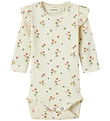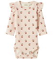 Beautiful Lil' Atelier bodysuit in a light rose ribbed quality and with an all-over-print of cherries in red and green shades. The Bodysuit has long sleeves with fine ruffle details at the shoulders.