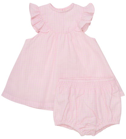 Elegant Minymo dress in light rose with a check pattern. The Dress has short ruffle sleeves and a round neckline.