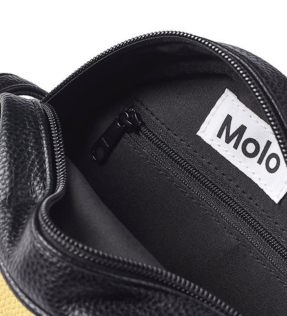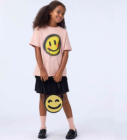 Stylish Molo shoulder bag in black with an eye-catching yellow smiley print on the front and a purple smiley print on the back. The Molo bag has a practical, adjustable shoulder strap and a round shape that makes it both functional and trendy.