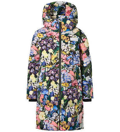 Lovely Molo paddet jacket with a multicolour all-over floral print in a painted style. The duvet coat has horizontal seams and a logo rubber application on the left chest.