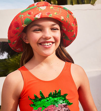 Fresh Molo swimsuit in orange with a strawberry print of sequins that has a changing effect.
