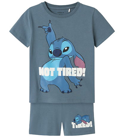 Charming Name It pyjama set in a beautiful blue colour with short sleeves. The T-shirt is adorned with a large print with Stitch and the text "Not Tired!", which is recreated on the shorts. Name It ensures fun pyjama set.