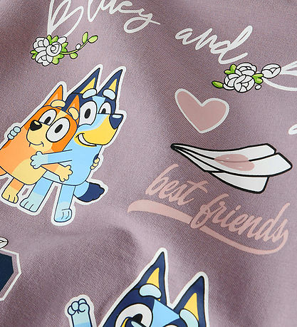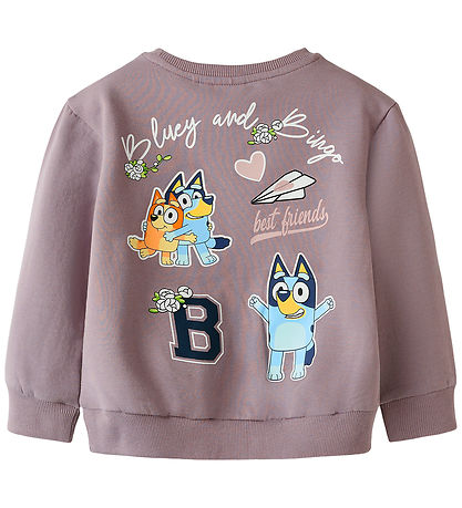Beautiful Name It sweatshirt in a muted purple shade with different Bluey motifs on the front and back. The Sweatshirt has a round neckline and long sleeves with ribbed edges. The inside is soft, brushed cotton.