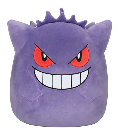 Cool Squishmallows soft toy in the shape of the pokémon Gengar, designed as a round cushion with an embroidered face and details.