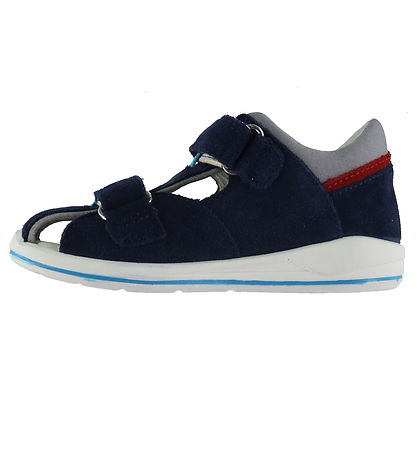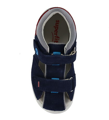 Beautiful Superfit sandals in dark blue suede with fine details in grey, red and light blue made of coarse suede and textile.