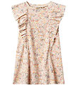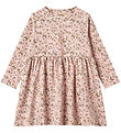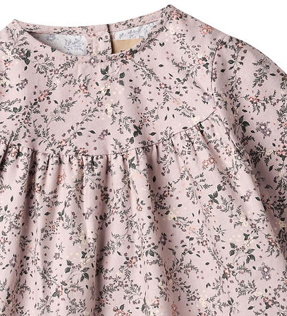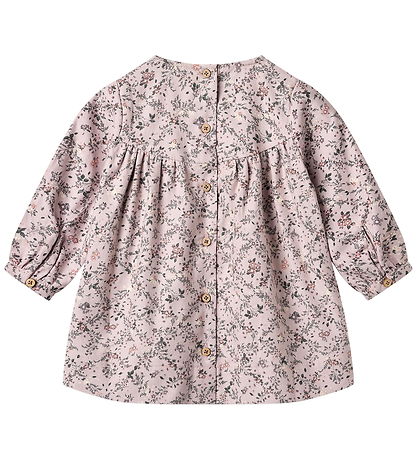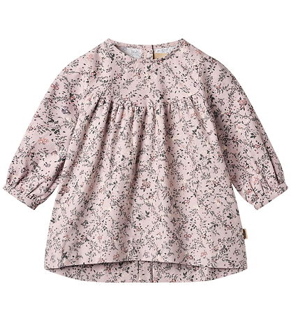 Elegant dress from Wheat in dusty purple with a fine floral print. The Dress has long sleeves and a classic round neckline. The Wheat dress closes at the back with continuous pull buttons, and the fine gathers at the chest give a slight fall.